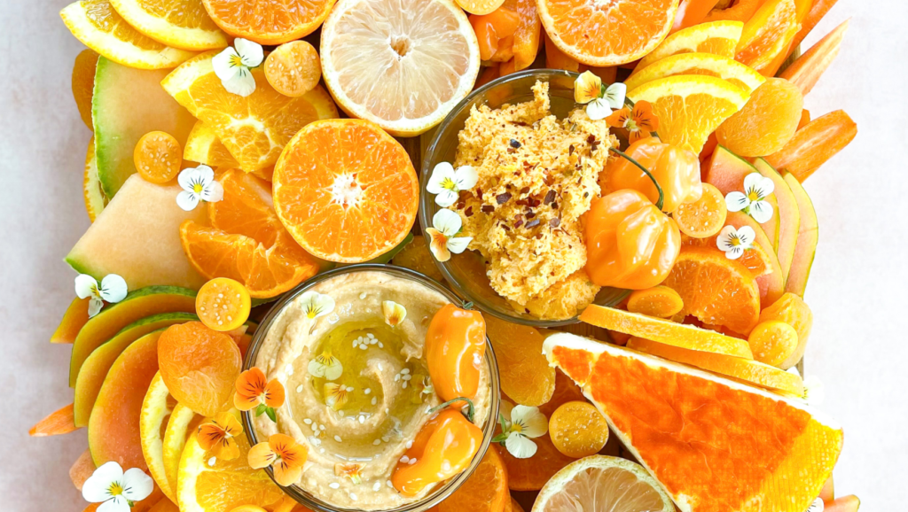 Slice the cherry tomato in half to create the center of the daisy. I used yellow tomatoes but red or orange would work great as well