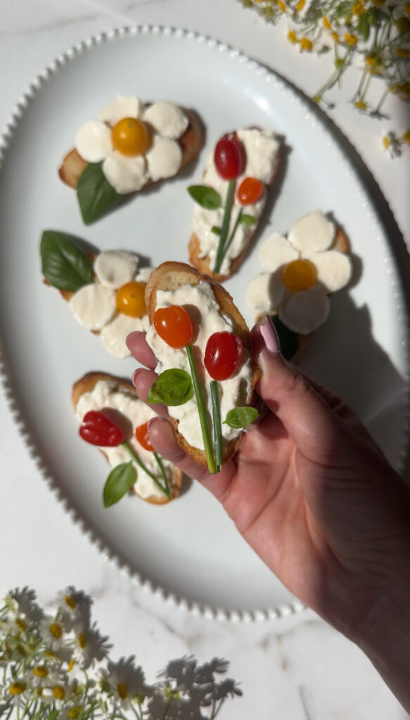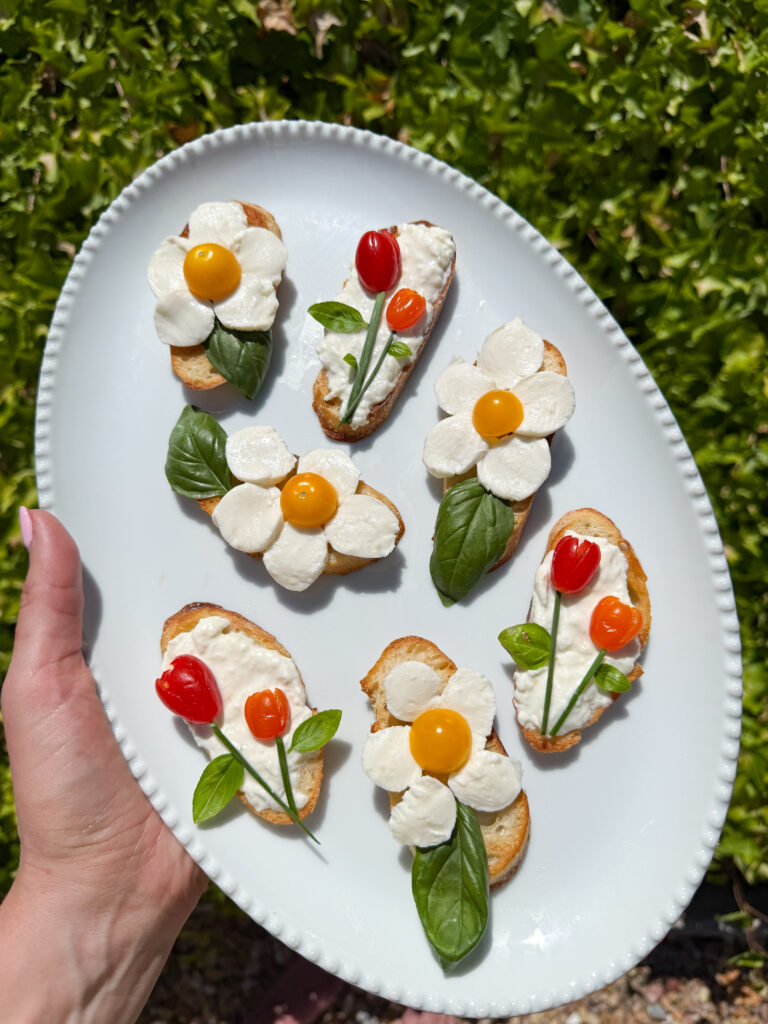 These beautiful flower bruschetta are the ultimate show-stopping appetizer. Creamy stracciatella and mozzarella on toasted bread is topped with fresh herbs and tomatoes in the shape of flowers for a stunning, garden-inspired bite.